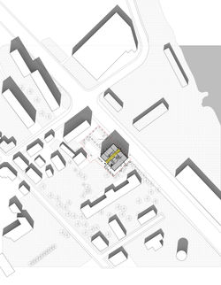 The project proposes a simple cubic volume for the mixed-use building. The cube is cut with contrasting public voids that become gathering spaces for different inhabitants of the building. The optical yellow-black facade shows the building in different coloring , depending on where the passer-by looks at.